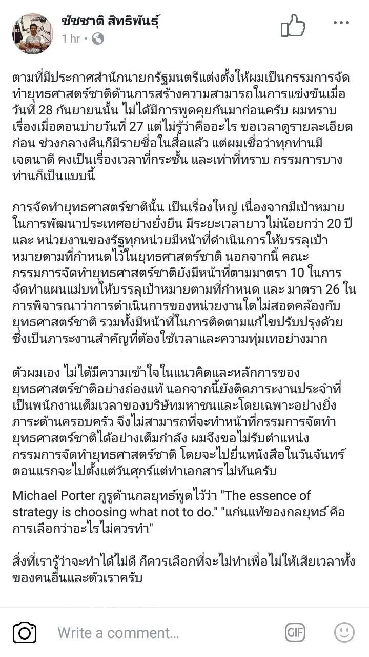 ตัวผมเอง ไม่ได้มีความเข้าใจในแนวคิดและหลักการของยุทธศาสตร์ชาติอย่างถ่องแท้ นอกจากนี้ยังติดภาระงานประจำที่เป็นพนักงานเต็มเวลาของบริษัทมหาชนและโดยเฉพาะอย่างยิ่งภาระด้านครอบครัว จึงไม่สามารถที่จะทำหน้าที่กรรมการจัดทำยุทธศาสตร์ชาติได้อย่างเต็มกำลัง ผมจึงขอไม่รับตำแหน่งกรรมการจัดทำยุทธศาสตร์ชาติ โดยจะไปยื่นหนังสือในวันจันทร์ ตอนแรกจะไปตั้งแต่วันศุกร์แต่ทำเอกสารไม่ทันครับ