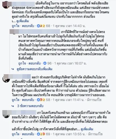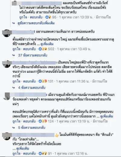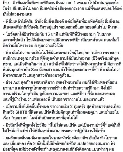 เพจเฟซบุ๊ก “ฟังไปเรื่อย ดูไปเรื่อย” ออกมาวิจารณ์ทั้งเรื่องความพร้อมการจัดงาน รวมถึงพฤติกรรมบนเวทีของนักร้องรุ่นใหญ่ ที่ดื่มเครื่องดื่มแอลกอฮอล์ ต่อหน้าเยาวชนและผู้ชมจำนวนมาก ทำให้การแสดงอาจจะออกมาไม่สมกับการรอคอยของแฟนคลับบางกลุ่ม