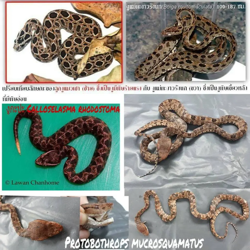 ภาพเปรียบเทียบความคล้ายคลึงกับงูชนิดอื่นๆ ซ้ายบน,ขวาบน : ลูกงูแมวเซา , งูแม่ตะงาวรังนก กลางซ้าย : ลูกงูกะปะ ภาพที่เหลือ : งู Protobothrops mucrosquamatus