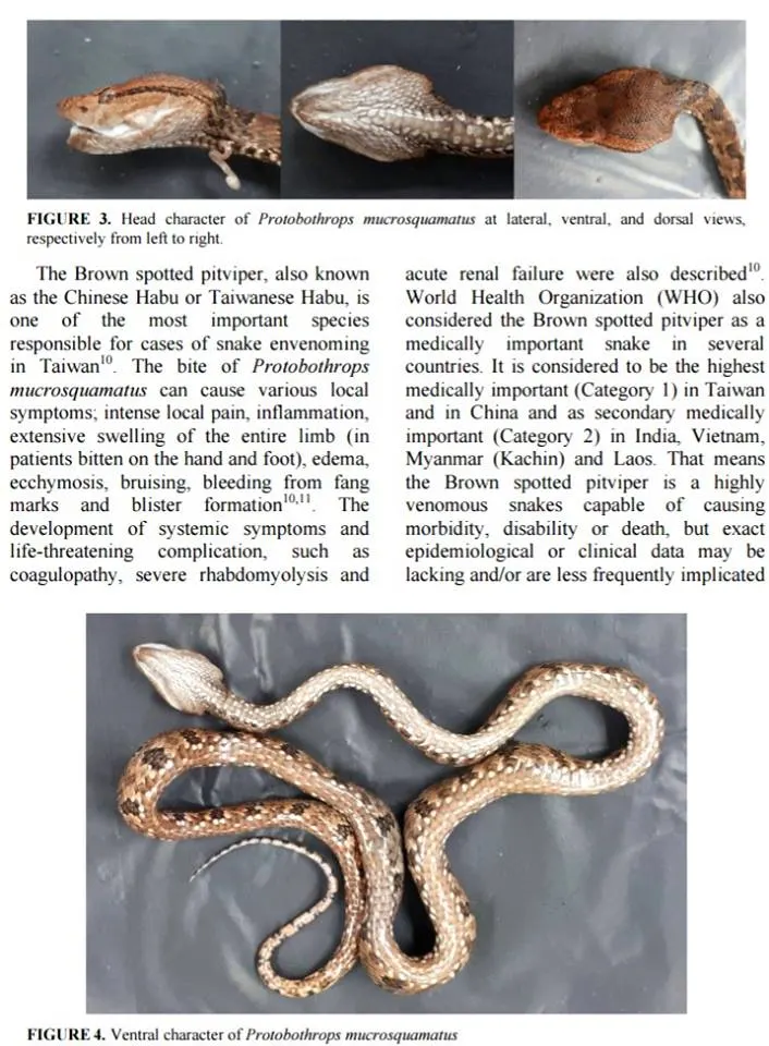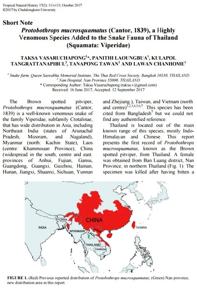 เมื่อสัปดาห์ที่ผ่านมา สวนงู สถานเสาวภา ได้ตีพิมพ์รายงานการแพร่กระจายของงูพิษชนิดหนึ่งที่จังหวัดน่าน Brown spotted pit viper (Protobothrops mucrosquamatus)
