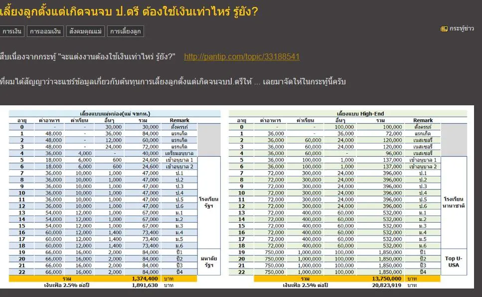 แต่เห็นพี่ๆที่ทำงานแย้งว่ายังไงก็เกินล้าน ผมเลยเกิดความสนใจว่า เลี้ยงเด็กคนนึงมันใช้เงินเยอะขนาดนั้นจริงรึเปล่า