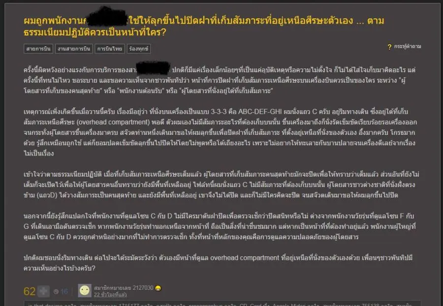 หน้าที่ใคร !!? หนุ่มโพสต์ถาม กรณีถูกสจวร์ดใช้ให้ปิดช่องเก็บสัมภาระ