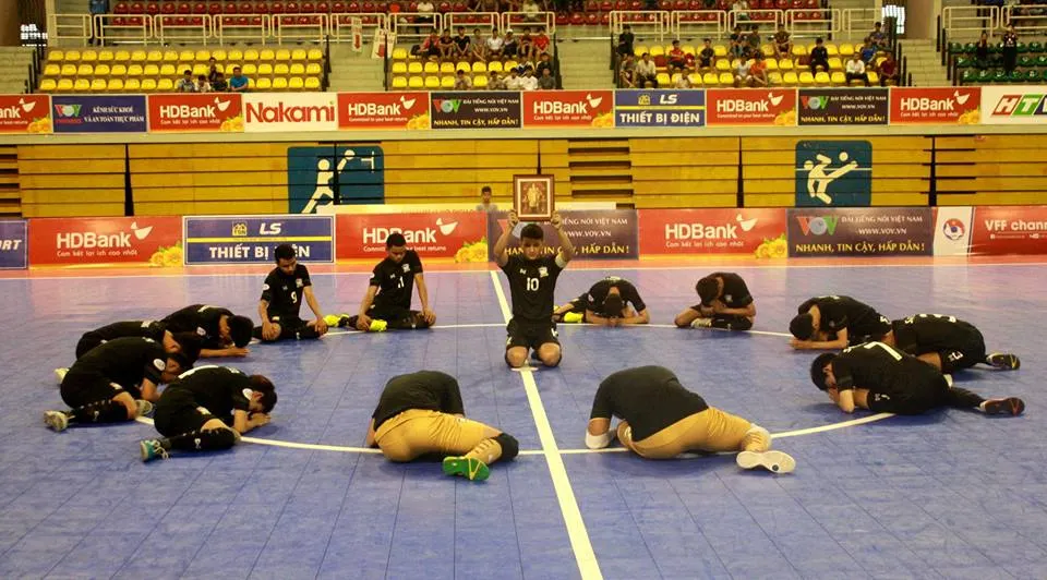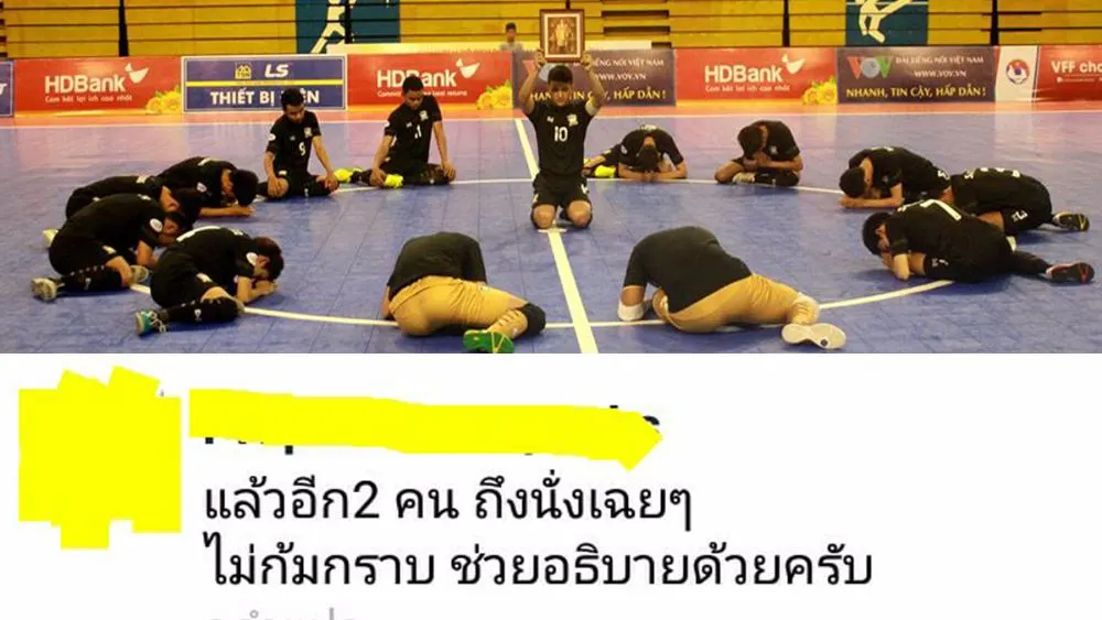 จะสังเกตได้ว่า ในภาพมีนักฟุตซอลทีมชาติไทย 2 คนที่ไม่ได้ก้มลงกราบพระบรมฉายาลักษณ์ พระบาทสมเด็จพระปรมินทรมหาภูมิพลอดุลยเดช บรมนาถบพิตร คือ (หมายเลข 9) นายวรุฒ หวังสะมะแอล และ (หมายเลข 11) นายมูฮัมหมัด อุสมานมูซา ในขณะที่เพื่อนร่วมทีมและสตาฟฟ์โค้ชต่างก้มลงกราบกันอย่างพร้อมเพรียงกัน...