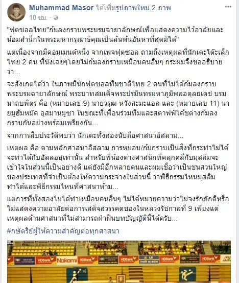 เกิดเป็นประเด็นขึ้นมาจากกรณีที่ ทีมฟุตซอลไทย ก้มลงกราบพระบรมฉายาลักษณ์เพื่อแสดงความไว้อาลัยแต่มี นักกีฬา 2 คน ที่นั่งเฉยๆ โดยไม่ก้มลงกราบเหมือนคนอื่นๆจนมีชาวเน็ตถามว่าทำไมไม่ก้มกราบ เนื่องจากว่าทั้งสองคนเป็นมุสลิม
