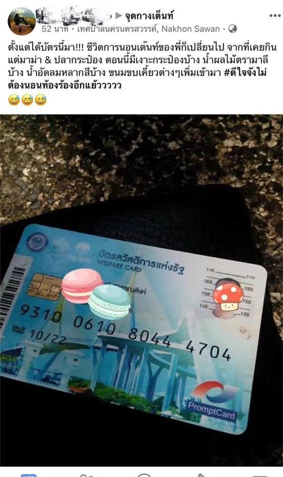 เมื่อวันที่ 1/11/2560 เพจดังอย่าง คว าย + Social V.3 ได้โพสต์เรื่องราว ของหนุ่มคนนหนึ่ง ที่โพสต์ไปยังเพจ จุดกางเตน?์ว่า ตั้งแต่ได้บัตรมา ชีวิตการนอนเตนท์ของพี่ก็เปลี่ยนไป จากที่เคยกินแต่มาม่า & ปลากระป๋อง เงาะกระป๋องบ้าง น้ำผลไม้ตรามาลี น้ำอัดลมหลากสีบ้าง ขนมขบเคี้ยวต่าง ๆ เพิ่มเข้ามา #ดีใจจังไม่ต้องนอนท้องร้องอีกแย้ววววว