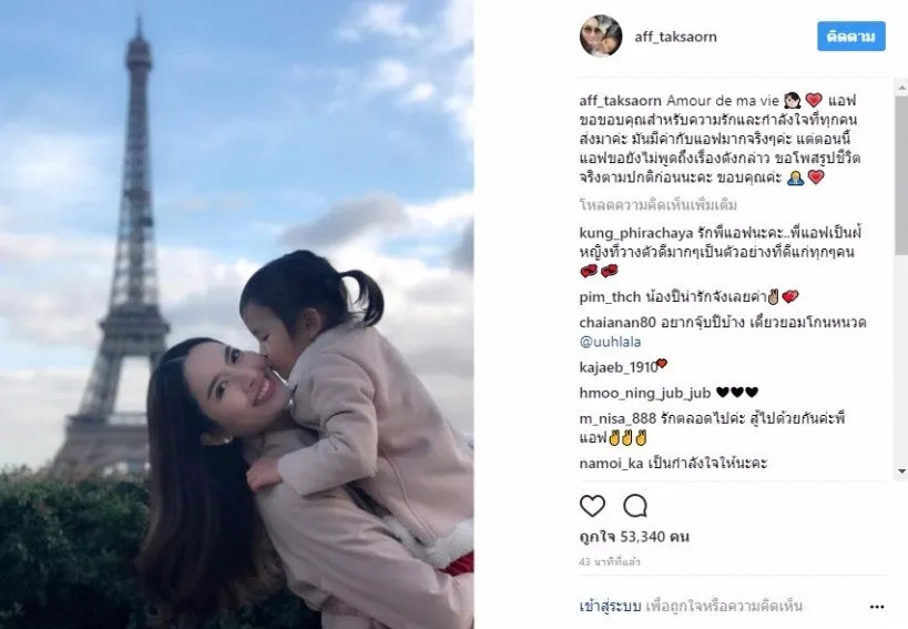 2 พ.ย. 60 จากกรณีกระแสข่าว เรื่องเซ็นใบหย่ากันแล้วระหว่าง แอฟ-สงกรานต์ ล่าสุดแอฟ ทักษอร โพสต์เคลื่อนไหว ผ่านอินสราแกรมครั้งแรกหลังยอมรับว่าหย่ากันแล้ว พร้อมภาพถ่ายขณะน้องปีใหม่กำลังจุ๊บแก้มแอฟ คุณแม่เลี้ยงเดี่ยวด้วยความรัก กับฉากหลังหอไอเฟล ที่ประเทศฝรั่งเศส