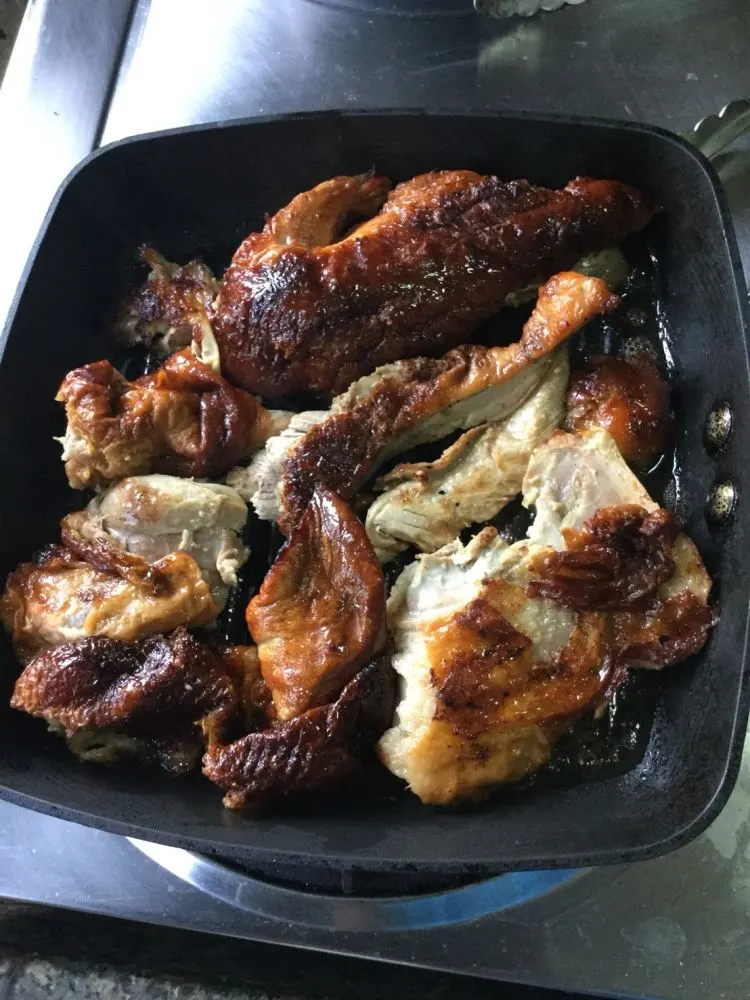 1.เลาะกระดูกออกจากเป็ดย่างที่เตรียมไว้แล้วนำไปย่างบนกระทะย่างค่ะ ขั้นตอนนี้ทำเพื่อให้เป็ดย่างกลับมาหอมอีกครั้ง