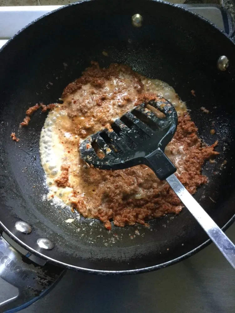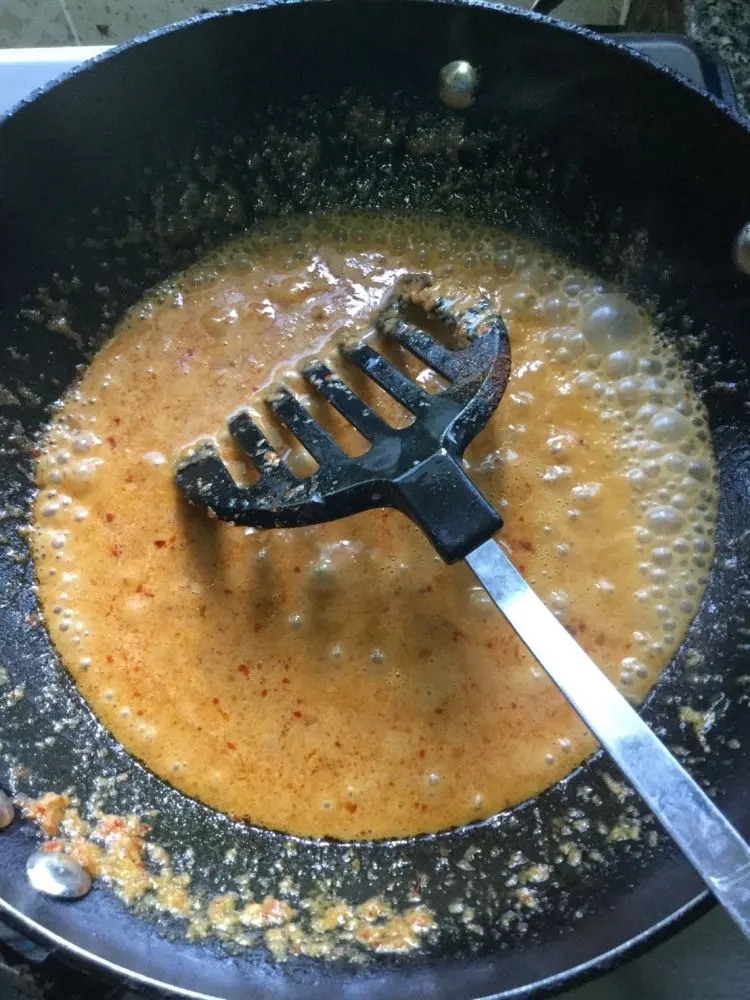 2.ใส่น้ำมันพืชเล็กน้อยผัดกับพริกแกง แล้วค่อยๆเติมหัวกะทิทีละน้อยจนพริกแกงหอมค่อยใส่หางกะทิเพิ่ม
