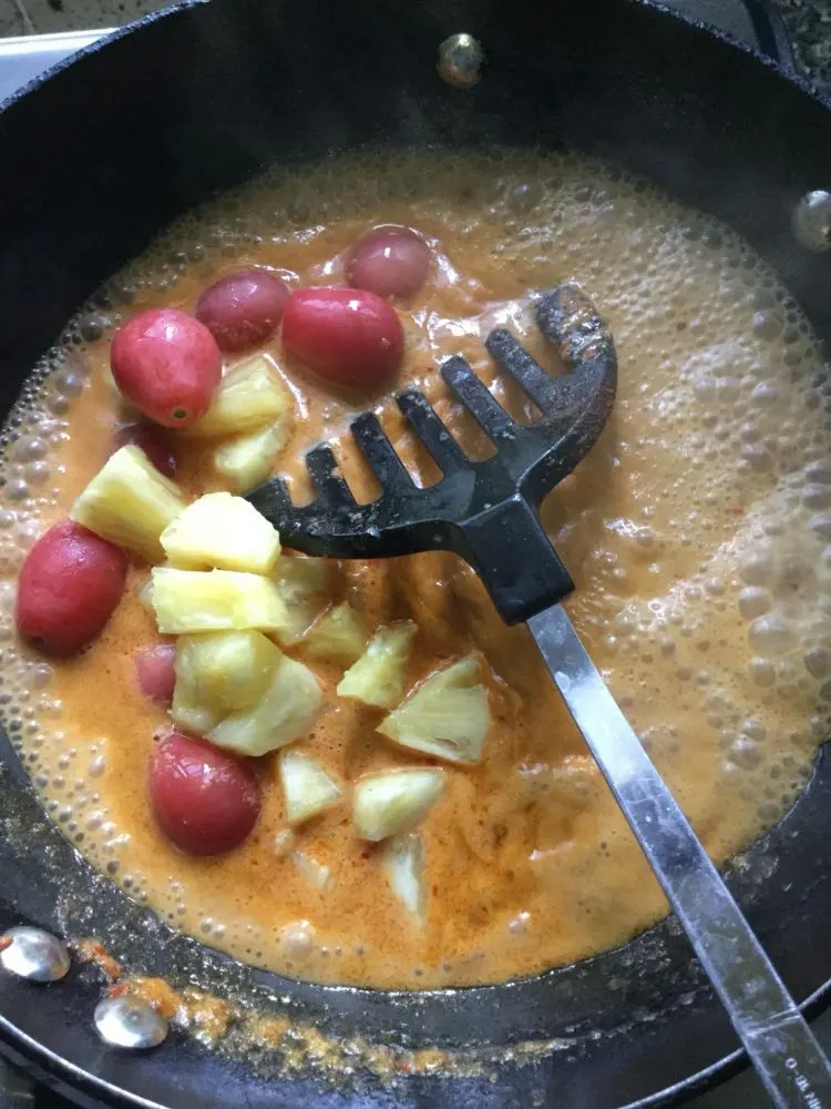 3.ใส่มะเขือเทศกับสับปะรด เติมน้ำตาล น้ำปลาตามรสชาติที่ชอบค่ะ รสชาติจะประมาณว่าเปรี้ยวเค็มหวาน