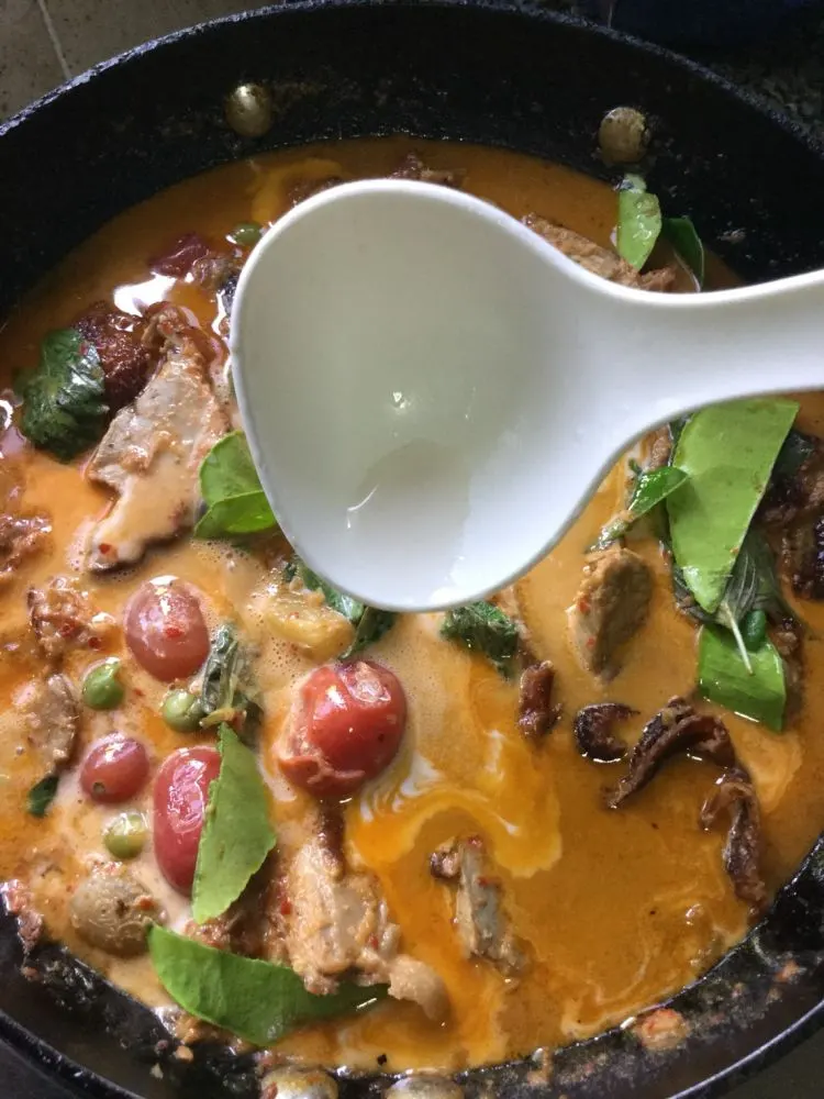 4.เมื่อชิมแล้วได้รสที่ต้องการ ใส่มะเขือพวงแล้วตามด้วยเป็ดย่าง ต้องใส่เป็ดทีหลังเพื่อจะได้เป็นชิ้นน่าทานค่ะ