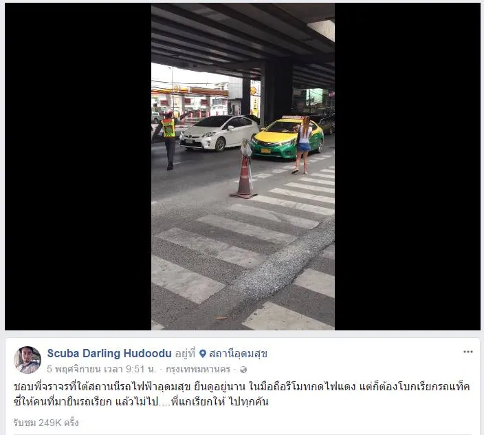 ในคลิปคือใต้สถานีรถไฟฟ้าอุดมสุข ก็เลยมีคนมายืนรอโบกแท็กซี่อยู่หลายคน แต่โบกอยู่นานก็ไม่ได้ไปซักที เพราะพี่แท็กซี่แกก็เลือกลูกค้าเหลือเกิน จนเจ้าหน้าที่ตำรวจที่อยู่แถวนั้นทนไม่ได้ ต้องมาโบกแท็กซี่ให้ประชาชน ที่นี่กลายเป็นว่าแท็กซี่ยอมรับผู้โดยสารทุกคัน บางคันนี่ผู้โดยสารยังไม่ทันบอกเลยว่าจะไปไหนพี่แกก็รีบออกรถไปซะแล้ว