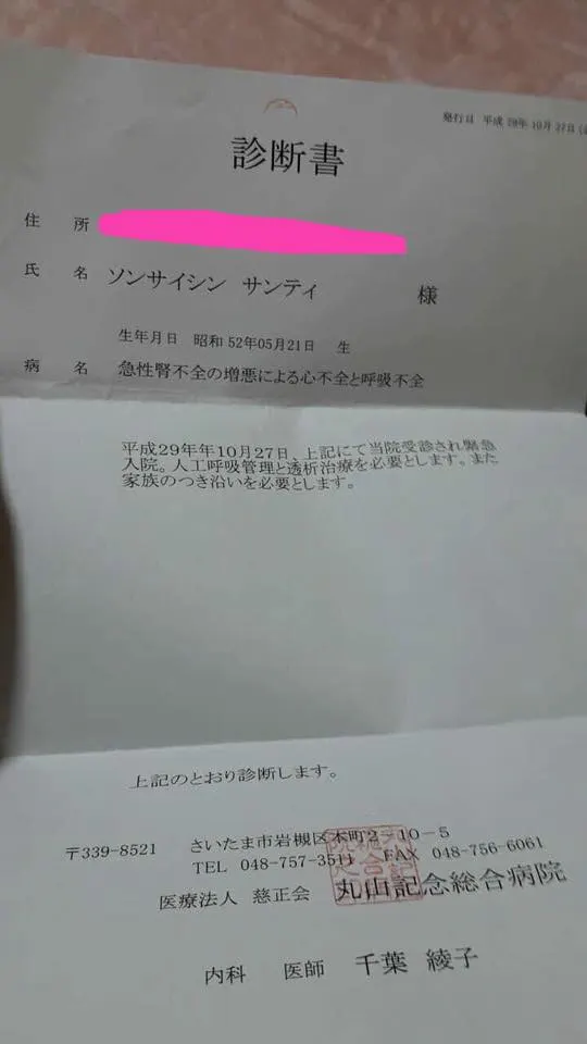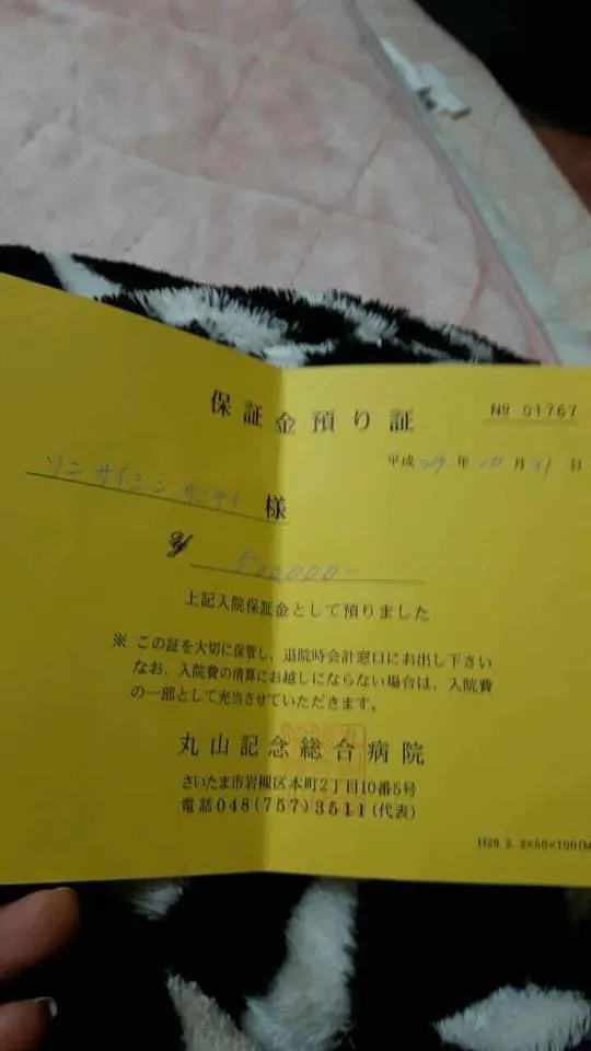 คนไทยที่รู้จักกันได้พาไปโรงพยาบาล และจากการวินิจฉัยของแพทย์พบว่าสามีของน้องป่วยเป็นโรคไตวายเฉียบพลัน ระบบหายใจล้มเหลว น้องได้ให้ญาติพี่น้องที่เมืองไทยโอนเงินมาให้เป็นเงินจำนวนห้าแสนเยน เพื่อใช้วางเป็นเงินมัดจำการรักษาพยาบาลเนื่องจากไม่มีวีซ่าทำงานจึงทำให้ไม่มีประกันสุขภาพใดๆด้วยนั่นเอง ขณะนี้ค่ารักษาพยาบาลพุ่งขึ้นไปเป็นล้านเยนแล้วล่ะครับ 〜