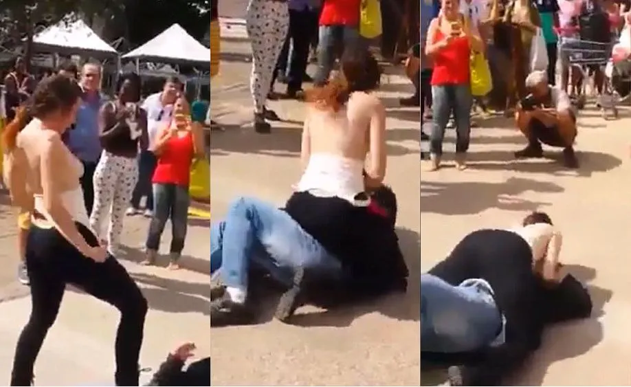 คลิปวีดีโอดังกล่าวเกิดขึ้นกลางเมืองริเบยเรา เปรโต ทางตะวันออกเฉียงใต้ของบราซิล เป็นภาพของหญิงสาวคนหนึ่ง ที่ยืนแจกใบปลิวแถวนั้น ยืนเหนียบอกผู้ชายคนหนึ่งซึ่งถูกกล่าวหาว่าลวนลามเธอ และท่ามกลางความตกอกตกใจของคนแถวนั้น