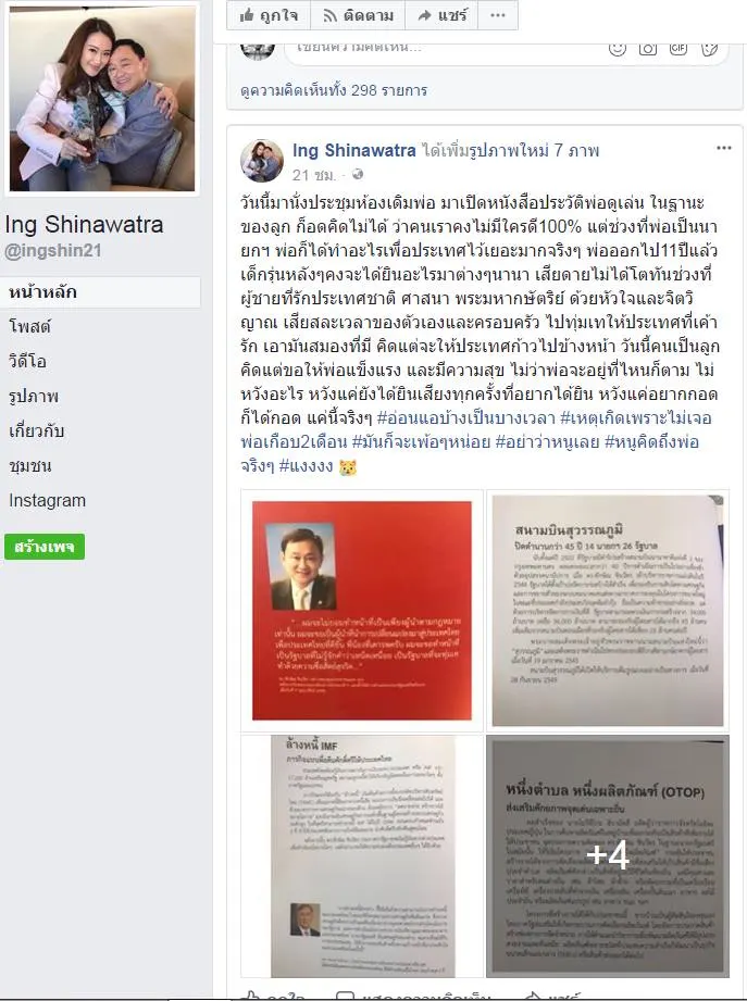 เมื่อวันที่ 8/11/2560 ที่ผ่านมา น.ส.แพทองธาร ชินวัตร หรือ อุ๊งอิ๊ง บุตรสาวคนสุดท้องของ นายทักษิณ ชินวัตร อดีตนายกรัฐมนตรี ได้โพสต์ภาพและข้อความผ่านเฟซบุ๊ก ตามข้างล่าง