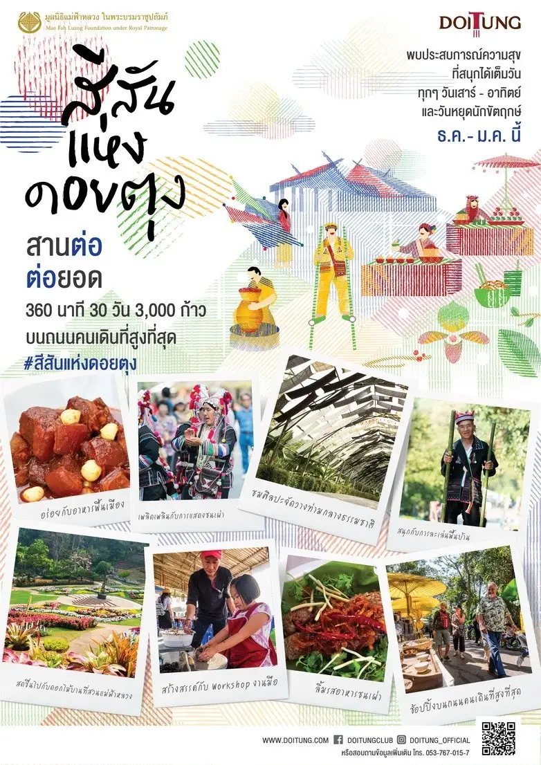มูลนิธิแม่ฟ้าหลวง ในพระบรมราชูปถัมภ์ ขอเชิญร่วมงาน เทศกาล “สีสันแห่งดอยตุง” ครั้งที่ 4 เทศกาลแห่งรอยยิ้มและความสุขบนถนนคนเดินสายวัฒนธรรมที่สูงที่สุดในประเทศไทย เพื่อร่วมสืบสานพระราชปณิธาน “ช่วยเขาให้เขาช่วยตัวเอง” ผ่านโครงการพัฒนาดอยตุงฯ อันสะท้อนถึงพระวิสัยทัศน์อันยาวไกลและพระราชปณิธานอันแน่วแน่ของสมเด็จพระศรีนครินทราบรมราชชนนี ที่ทรงมีพระราชประสงค์ที่จะให้คนพึ่งพาตนเองได้อย่างมีศักดิ์ศรี อยู่กับป่าได้อย่างยั่งยืน และเป็นการร่วมน้อมรำลึกถึงพระบาทสมเด็จพระปรมินทรมหาภูมิพล อดุลยเดช บรมนาถบพิตร