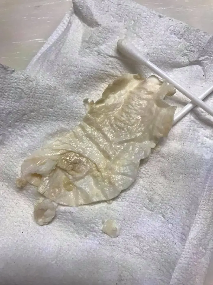 วันอาทิตย์ที่12 พย.60 ตัดสินใจแน่วแน่ คือรอไม่ไหวละ เลยทำเหมือนเดิม ส่องกระจก เอาไฟฉายส่อง คอตต้อนบัดเขี่ย ก็เขี่ยยากมาก แผ่นมันใหญ่มากกกกกกกกกกกกก หนาด้วย ต้องเบ่งไปด้วย เขี่ยไปด้วย พอขมิบเมื่อไร เอ้าหายไปไหนละวะ คือลำบากมากกกก. จนเบ่งสุดแรงเกิด ไอ้แผ่นขาวๆนั่นมันก็ดันออกมา เราเลยเอานิ้วดึง ดึงไปเบ่งไป หลายเฮือกมาก เหมือนคนคลอดลูก ฮึดสุดท้าย เบ่งยาวๆให้ปากช่องคลอดมันกว้างๆ แล้วดึงออกมา. โอ้โห!!! ตกใจ!!! ออกมาเป็นแผ่นในรูปนั่นแหละ ชิ้นใหญ่มากกกกก ขนาดกว้าง3เซน ยาว8เซนได้ พอส่องกระจกดู โล่งหมดเลยค่ะ ไม่มีแผ่นอะไรค้างอยู่ข้างในแล้ว สะอาดหมดจด