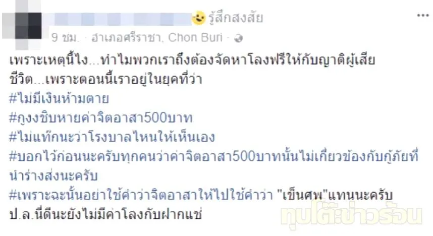 "เพราะเหตุนี้ไงทำไมพวกเราถึงต้องจัดหาโลงฟรีให้กับญาติผู้เสียชีวิตเพราะตอนนี้เราอยู่ในยุคที่ว่า #ไม่มีเงินห้ามตาย #งงค่าจิตอาสา500บาท #ไม่แท็กนะว่าโรงพยาบาลไหนให้เห็นเอง
