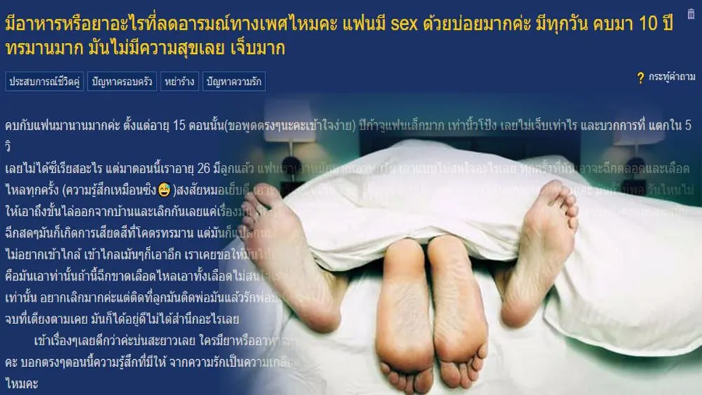 สมาชิกเวบไซต์พันทิป หมายเลข 4225788 ได้โพสท์ถามและขอระบายว่า แฟนเซ็กซ์จัดมาก มีทุกวัน คบกันมา 10 ปีไม่มีความสุข เจ็บมาก มีวิธีไหนที่ทำให้เเฟนอารมณ์ทางเพศลดลงบ้าง? โดยโพสท์ระบุว่า