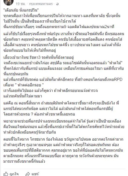 ตอนนี้โมโหมาก โกรธมาก ร้องไห้เลย ขวัญหายไปหมด อยากตะโกนด่ามาก ถ้าฟาดกูจริงๆ กูเอาตายแน่ๆอะ แต่ถ้าฟาดมาจริงกูก็ไม่รอดเช่นกันนะ ต้องขอบคุณพี่แกรปที่มีสติมากกก คุมรถอยู่มาก ขอให้พี่ปลอดภัยไม่โดนพวกมันตามอีกนะคะ ครั้งแรกที่โดนแบบนี้อะ ตายกูตาย ระวังกันด้วยนะทุกคน มันมาระรานถึงขนาดนี้กันแล้ว