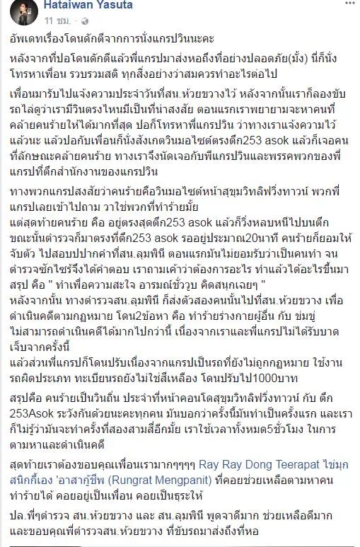เมื่อวานนี้ 21/11/2560 ผู้ใช้เฟซบุ้ครายหนึ่งชื่อว่า Hataiwan Yasuta โพสต์เฟซ ว่า ถูกคนขับขี่รถจักรยานยนต์รับจ้างขับรถตามมาเพื่อจะทำร้ายร่างกายตัวเองและคนขับแกร็บรถจักรยานยนต์ที่เธอเรียกใช้บริการ โดยเนื้อหา ตามรายละเอียดด้านล่าง