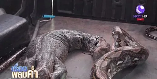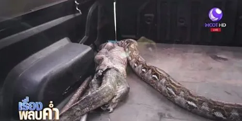เจ้าของบ้านสยอง เมื่อพบงูเหลือมท้องป่องขนาดใหญ่เลื้อยเข้าโพรงหลังบ้าน เจ้าหน้าที่กู้ภัยต้องใช้ค้อนทุบพื้นปูน นานประมาณ 1 ชั่วโมง จึงจะสามารถดึงงูออกจากพื้นปูนมาได้ โดยงูเหลือมใหญ่มีความยาวมากกว่า 4 เมตร หนักประมาณ 20 กิโลกรัม บริเวณท้องป่อง คาดว่าเพิ่งกินอาหารเข้าไป