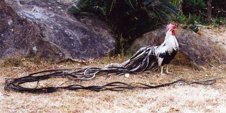 ไก่ที่ว่านี้มีชื่อว่า Onagadori หรือ Long-tailed Chicken ซึ่งเป็นชื่อที่รู้จักกันทั่วไป ไก่ Onagadori นั้นมีต้นกำเนิดในจังหวัด โคจิ ประเทศญี่ปุ่น และมันก็ถูกอนุรักษ์ไว้เป็นอย่างดีมาจนถึงปัจจุบัน เป็นไก่ที่มีขนาดเท่าๆกับไก่บ้านของไทยเรา นำนักตัวโตเต็มที่ประมาณ 1.8 กิโลกรัม ตัวผู้มีขนาดใหญ่กว่าตัวเมีย ความพิเศษของไก่ Onagadori นั้นอยู่ที่หางครับ โดยเฉพาะตัวผุ้นี่หางยาวมากๆ เฉลี่ยความยาวอยู่ที่ 80 – 100 เซนติเมตร แต่ในอดีตนั้นเคยมีการบันทึกความยาวของหางไก่สายพันธุ์นี้ได้ยาวถึง 13 เมตร แต่ในปี 2013 วัดได้ สูงสุดที่ 3.6 เมตร เท่านั้น แต่ก็ยังถือว่าเป็นไก่ที่หางยาวที่สุดในโลกอยู่เช่นเคย