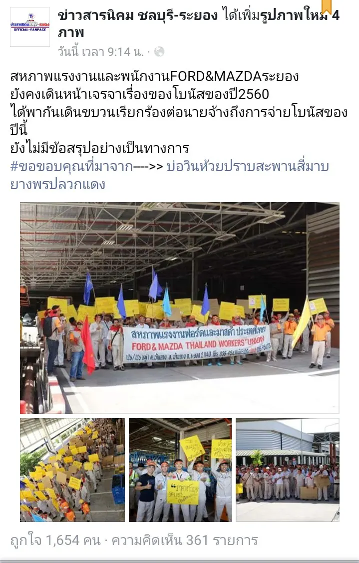 ล่าสุดบนเฟสบุ๊ค "ข่าวสารนิคม ชลบุรี-ระยอง" ก็ได้เผยแพร่ทั้งภาพทั้งเสียงเหตุการณ์ที่พนักงานโรงงานต่างๆ ในนิคมอุตสาหกรรมชลบุรีและระยอง รวมตัวเรียกร้องขอเพิ่มโบนัสปลายปี โดยเป็นพนักงานนับพันคนของบริษัทรถยนต์ 2 แห่ง(เขามีหลายสาขานะครับ เขาถึงกันอยู่แล้ว) เพื่อเจรจานายจ้างในการจ่ายโบนัสปลายปี 2560 ซึ่งในปีที่แล้วได้รับโบนัสกว่า 8 เดือน และเงินพิเศษอีก 62,000 บาท แต่ในปีนี้ยังคงเงียบ