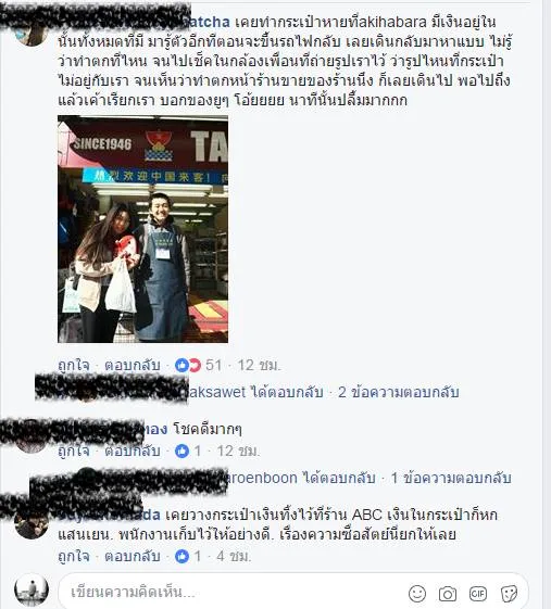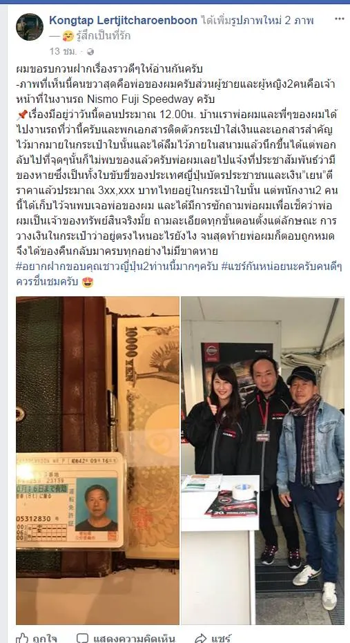 ซึ่งเป็นทั้งใบขับขี่ของประเทศญี่ปุ่นบัตรประชาชนและเงิน”เยน”ตีราคาแล้วประมาณ 3xx,xxx บาทไทยอยู่ในกระเป๋าใบนั้น แต่พนักงาน2 คนนี้ได้เก็บไว้จนพบเจอพ่อของผม และได้มีการซักถามพ่อผมเพื่อเช็คว่าพ่อผมเป็นเจ้าของทรัพย์สินจริงมั้ย ถามละเอียดทุกขั้นตอนตั้งแต่ลักษณะ การวางเงินในกระเป๋าว่าอยู่ตรงไหนอะไรยังไง จนสุดท้ายพ่อผมก็ตอบถูกหมดจึงได้ของคืนกลับมาครบทุกอย่างไม่มีขาดหาย