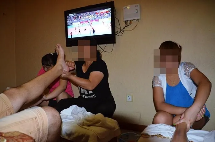 ร้านนวดในเขตเฉาหยัง กรุงปักกิ่ง ด้านหน้าตกแต่งเป็นร้านตัดผมทั่วไป แต่ด้านในมีห้องลับหลายห้อง โดยระหว่างการตรวจค้น เจ้าหน้าที่ตำรวจได้พบคู่ชายหญิงนอนเปลือยกายอยู่ในห้องลับดังกล่าว นอกจากนี้ยังค้นเจอของกลางเป็นถุงยางอนามัยทั้งแบบใช้แล้วและยังไม่ได้ใช้อีกจำนวนมาก