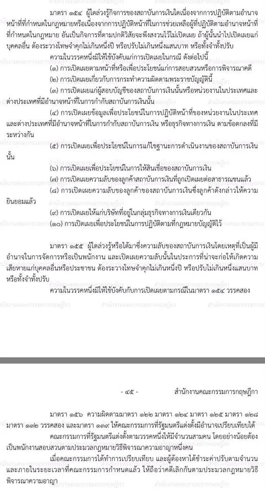 โดยได้ชี้ข้อกฏหมายระบุว่า พ.ร.บ ธุรกิจสถาบันการเงิน พ.ศ.2551 มาตรา154-155 ห้ามมิให้บุคคลผู้ล่วงรู้หรือได้มาซึ่งความลับของลูกค้าโดยเหตุที่เป็นผู้มีอำนาจในการจัดการหรือเป็นพนักงาน และเปิดเผยความลับนั้น เว้นแต่ได้รับความยินยอมจากลูกค้า หรือเข้ากรณียกเว้นอื่นตามที่กฎหมายกำหนด เช่น เปิดเผยเพื่อประโยชน์แก่การสอบสวนหรือพิจารณาคดี เปิดเผยเพื่อประโยชน์ในการให้สินเชื่อ เปิดเผยให้แก่บริษัทที่อยู่ในกลุ่มธุรกิจทางการเงินเดียวกัน เป็นต้น