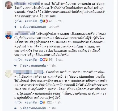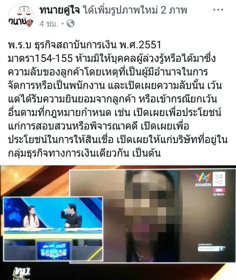 ด้านทางเพจเฟซบุ๊กทนายคู่ใจ โพสท์ ป้องสิทธิเกี่ยวกับการเปิดเผยข้อมูลส่วนตัวของลูกค้า พ.ร.บ ธุรกิจสถาบันการเงิน พ.ศ.2551 มาตรา154-155 โดยไม่ได้รับความยินยอม หลังพนักงานแบงค์เปิดเผยข้อมูลส่วนตัวของมิจฉาชีพออกสู่สาธารณะ