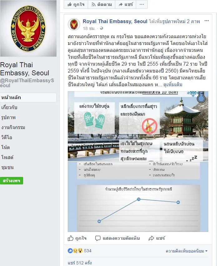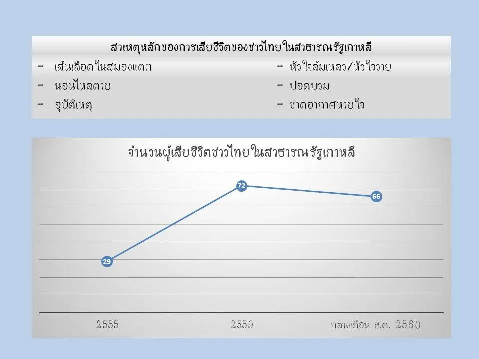 สถานเอกอัครราชทูต ณ กรุงโซล ขอแสดงความกังวลและความห่วงใยมายังชาวไทยที่พำนักอาศัยอยู่ในสาธารณรัฐเกาหลี โดยขอให้เอาใจใส่ดูแลสุขภาพของตนตลอดระยะเวลาการพำนักอยู่ เนื่องจากจำนวนคนไทยที่เสียชีวิตในสาธารณรัฐเกาหลี มีแนวโน้มเพิ่มสูงขึ้นอย่างต่อเนื่องทุกปี จากจำนวนผู้เสียชีวิต 29 ราย ในปี 2555 เพิ่มขึ้นเป็น 72 ราย ในปี 2559 ทั้งนี้ ในปัจจุบัน (กลางเดือนธันวาคมของปี 2560) มีคนไทยเสียชีวิตในสาธารณรัฐเกาหลีแล้วจำนวนทั้งสิ้น 66 ราย โดยสาเหตุการเสียชีวิตส่วนใหญ่ ได้แก่ เส้นเลือดในสมองแตก หัวใจล้มเหลว/หัวใจวาย นอนไหลตาย ปอดบวม อุบัติเหตุ และขาดอากาศหายใจ