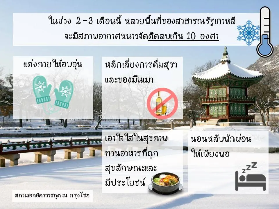 สถานเอกอัครราชทูตฯ จึงขอให้พี่น้องชาวไทยที่พำนักอยู่ในสาธารณรัฐเกาหลี โปรดเอาใจใส่ในสุขภาพของตนเป็นลำดับแรก ทานอาหารที่ถูกสุขลักษณะและมีประโยชน์ หลีกเลี่ยงการดื่มสุราและของมึนเมา ควรนอนหลับพักผ่อนให้เพียงพอแก่ความต้องการของร่างกาย ประกอบการงานอย่างมีสติรอบคอบตลอดเวลา และระมัดระวังในการแต่งกายให้อบอุ่นพอเพียงกับอากาศหนาวจัด โดยเฉพาะในช่วง 2-3 เดือนนี้ ที่มีสภาพอากาศหนาวจัดติดลบเกิน 10 องศาในหลายพื้นที่ของสาธารณรัฐเกาหลีด้วย
