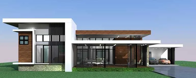 นี่คือแบบบ้านชั้นเดียวสไตล์โมเดิร์นผลงานการออกแบบโดย The Hillside-Design ใครชอบสไตล์นี้ต้องดูไว้เลยครับ ตัวบ้านโมเดิร์นสุดๆ ด้วยดีไซน์หลังคาเรียบ หน้าบ้านทรงกว้าง ใช้โครงสร้างหลักเป็นงานคอนกรีตเสริมเหล็ก สีสันภายนอกใช้โทนขาวผสมผสานกับงานไม้ และงานระแรงเหล็กเสริมความโมเดิร์นทันสมัย มีโรงจอดรถขนาด 4 คัน พร้อมด้วยลานกระเบื้องสำหรับจัดกิจกรรมกลางแจ้งขนาดใหญ่อีกด้วย