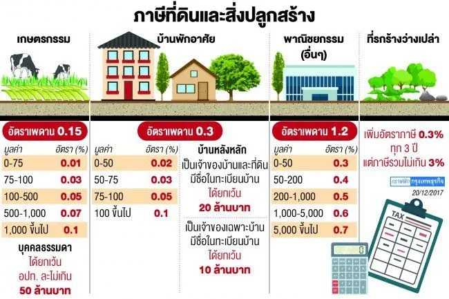 มีการประชุมเรื่องภาษีที่ดินและสิ่งปลูกสร้างเมื่อเร็วๆ นี้โดยระบุว่า "กมธ. เคาะอัตราภาษีที่ดินและสิ่งปลูกสร้าง โดยปรับลดลง 40% จากร่างเดิมที่ ครม. อนุมัติ หวังลดกระแสคัดค้าน ขณะ อัตราจัดเก็บจริงต่ำกว่าเกณฑ์ พร้อมยกเว้นภาษีบ้านหลังหลักมูลค่าไม่เกิน 20 ล้าน ส่วนที่ดินเพื่อเกษตรกรรมยกเว้นภาษีมูลค่าไม่เกิน 50 ล้าน คาดบังคับใช้ปี 2562 ด้าน คลัง เผยรายได้ภาษีจากเกณฑ์ใหม่ส่อลดเหลือ 3.7 หมื่นล้าน จากร่างเดิม 6-7 หมื่นล้าน" (https://goo.gl/Bo5ooF)