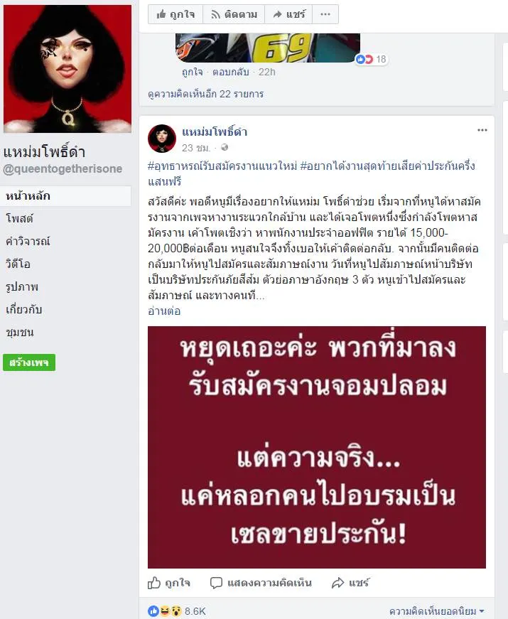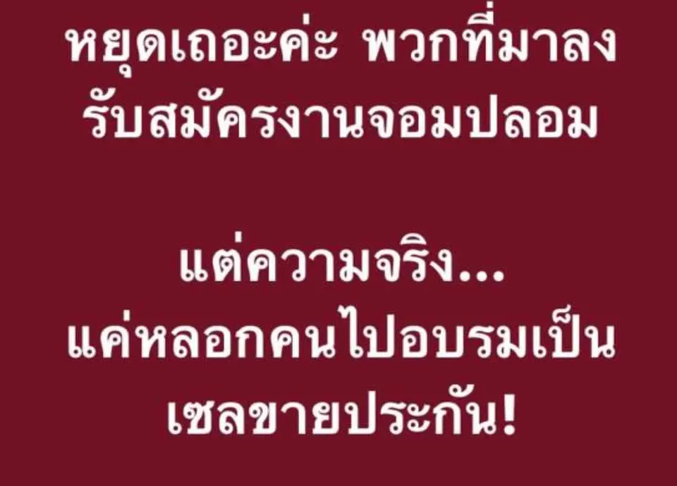 สวัสดีค่ะ พอดีหนูมีเรื่องอยากให้แหม่ม โพธิ์ดำช่วย เริ่มจากที่หนูได้หาสมัครงานจากเพจหางานระแวกใกล้บ้าน และได้เจอโพตหนึ่งซึ่งกำลังโพตหาสมัครงาน เค้าโพตเชิงว่า หาพนักงานประจำออฟฟิต รายได้ 15,000-20,000฿ต่อเดือน หนูสนใจจึงทิ้งเบอให้เค้าติดต่อกลับ. จากนั้นมีคนติดต่อกลับมาให้หนูไปสมัครและสัมภาษณ์งาน วันที่หนูไปสัมภาษณ์หน้าบริษัทเป็นบริษัทประกันภัยสีส้ม ตัวย่อภาษาอังกฤษ 3 ตัว หนูเข้าไปสมัครและสัมภาษณ์ และทางคนที่สัมภาษณ์เค้าบอกว่าไม่ได้ขายประกัน เค้ารับตำแหน่ง cm. และอาทิตย์ถัดไปเค้าจึงนัดมาอบรม หนูก็มาอบรมเพราะอยากได้งาน
