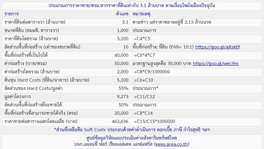 ตามข้อมูลของมูลนิธิประเมินค่าทรัพย์สินแห่งประเทศไทย มาตรฐานราคาค่าก่อสร้างสูงสุดสำหรับอาคารชุดสูงใหญ่ก็คือ 30,000 บาทต่อตารางเมตร (https://goo.gl/wec9m) ในที่นี้สมมติให้ค่าก่อสร้างเพิ่มเป็น 50,000 บาทต่อตารางเมตร ก็จะทำให้ค่าก่อสร้างโดยรวมเป็นเงิน 2,000 ล้านบาท และเมื่อรวมกับราคาที่ดินก็จะเป็นเงิน 5,100 ล้านบาท แต่นี่ยังไม่ได้เป็นมูลค่า เป็นค่า Hard Costs ซึ่งประกอบด้วยที่ดินและอาคาร ในที่นี้จึงสมมติให้มีสัดส่วนเป็น 55% ของมูลค่า ส่วนอีก 45% เป็น Soft Costs ซึ่งประกอบด้วยค่าดำเนินการ ดอกเบี้ย ภาษี กำไรสุทธิ และอื่น ๆ
