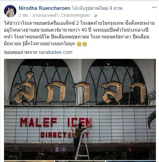 “ได้ข่าวว่าโรงภาพยนตร์เครือเอเพ็กซ์ 2 โรงสุดท้ายในกรุงเทพฯ ซึ่งตั้งตระหง่านอยู่ใจกลางย่านสยามสแควร์มานานกว่า 40 ปี จะทยอยปิดตัวในช่วงกลางปีหน้า โรงภาพยนตร์ลิโด ปิดเดือนพฤษภาคม โรงภาพยนตร์สกาลา ปิดเดือนมิถุนายน รู้สึกใจหายอย่างบอกไม่ถูก”