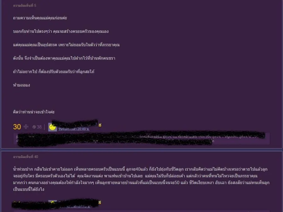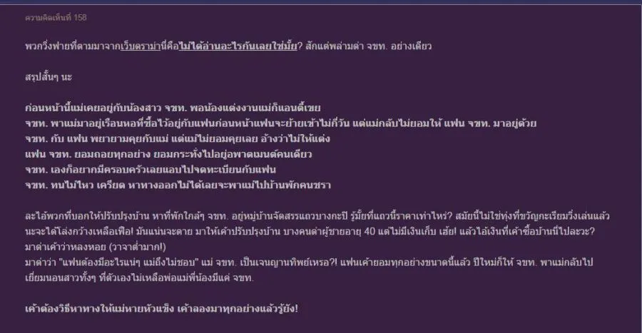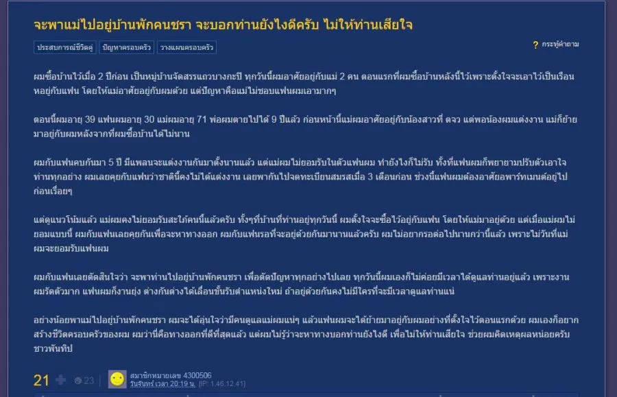 ตอนนี้ผมอายุ 39 แฟนผมอายุ 30 แม่ผมอายุ 71 พ่อผมตายไปได้ 9 ปีแล้ว ก่อนหน้านี้แม่ผมอาศัยอยู่กับน้องสาวที่ ตจว แต่พอน้องผมแต่งงาน แม่ก็ย้ายมาอยู่กับผมหลังจากที่ผมซื้อบ้านได้ไม่นาน