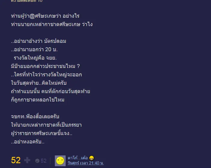 3.ไม่มีลายเซ็นผู้ว่าราชการจังหวัด รถกระบะกับรถเก๋งต้องซื้อสลากราคา 50 บาท ส่วนใบละ 20 บาทรางวัลใหญ่สุดเป็นรถจักรยานต์ เรากับแม่นี่อึ้งเลย เสียความรู้สึกมาก แต่ก็ไม่ได้โวยวายอะไร แค่งงว่าฉลากปลอมมันลงไปในบ่อได้ยังไง เจ้าหน้าที่ดูแลมีตั้งหลายคน ทำไมปล่อยให้สลากปลอมลงไปได้ หลังจากได้อธิบายกับเราสักพัก เจ้าหน้าที่ก็ใช้วิธีให้เราไปจับสลากใหม่ แล้วในช่วงที่เราไปตักสลากใหม่มีพิธีกรชายพูดบนเวทีในทำนองว่าเราเป็นคนปลอมสลากเอง เพราะอยากได้รางวัลใหญ่ แต่ยังดีมีเจ้าหน้าที่หญิงคนหนึ่งแย่งไมค์มาแก้ตัวให้ว่าเราไม่ได้ปลอมแต่อาจเป็นคนอื่น แต่เราก็ยังไม่พอใจพิธีกรชายอยู่ดี ยืนทำใจอยู่สักพักก็เดินไปเปิดสลากและรับของรางวัล รางวัลใหม่ที่ได้เป็นกระจาดพลาสติกราคาไม่ถึง 20 บาท