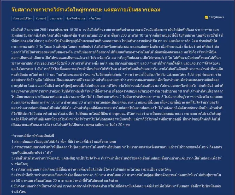 เมื่อวันที่ 2 มกราคม 2561 เวลาประมาณ 18.30 น. เราได้ไปเที่ยวงานกาชาดที่หน้าศาลากลางจังหวัดศรีสะเกษ เดินไปสักพักก็เจอ นารากาชาด เลยร่วมสนุกจับสลากชิงโชค โดยไปซื้อคูปองที่ซุ้ม จำหน่ายใบละ 20 บาท ซื้อมา 200 บาทได้ 10 ใบ จากนั้นนำคูปองที่ซื้อไปจับสลาก โดยที่งานใช้วิธี ใช้ที่ตักปลาต่อกับไม้ยาวๆ แล้วนำไปตักแค็บซูล(มีลักษณะคล้ายกับหลอดยาดม) ในบ่อที่ทางงานจัดทำขึ้น เรา แม่ และน้องสาวอีก 2คน ช่วยกันตักใส่กระจาดพลาสติก 2 ใบ ใบละ 5 แค็บซูล โดยเราขอยืนยันว่าไม่ได้จับหรือแตะต้องสลากเลยแม้แต่ครั้งเดียว เมื่อตักครบแล้ว ก็แจ้งเจ้าหน้าที่ประจำบ่อ บอกว่าให้ไปในส่วนของแผนกรับของรางวัล เรากับน้องสาวก็ถือสลากไปที่แผนกรับของรางวัลโดยไม่ได้แตะต้องสลากเลย พอไปถึง เจ้าหน้าที่เปิดสลากเป็นคนดำเนินการเปิดให้หมดและเป็นคนแจ้งเราว่าได้รางวัลอะไร สลากที่อยู่กับน้องสาวเปิดไปครบแล้ว 5 ใบ ได้เป็นรางวัลย่อยทั้งหมดได้เป็นกระจาดพลาสติก ส่วนของเราเปิดถึงใบที่ 3 เจ้าหน้าที่ท่าทางอึ้ง ตกใจ มองสลากแล้วมองเรา แล้วเจ้าหน้าที่ก็พากันกรี๊ดดีใจ แล้วแจ้งเราว่า"ดีใจด้วยค่ะ คุณได้รถกระบะ 1 คัน" เราก็ยังไม่เชื่อเลยถามเจ้าหน้าที่คนอื่นว่าได้จริงไหม เจ้าหน้าที่คนอื่นก็บอกว่าจริง เรายังไม่แน่ใจอีกกลับมาถามเจ้าหน้าที่คนเดิมคนที่เปิดสลากไม่ต่ำกว่า 3 รอบ "ผมได้รถกระบะจริงไหม คงไม่ใช่รถเด็กเล่นน่ะ " ทางเจ้าหน้าก็ยืนยันว่าได้จริง แล้วบอกให้เราไปถ่ายรูป รับของรางวัล ตอนนั้นเรายังอึ้ง หูอื้อ ได้ยินแต่เสียงแสดงความดีใจของเจ้าหน้าที่และคนรอบข้าง ส่วนเรามองหาแต่แม่เพื่อเรียกท่านมาเพื่อร่วมแสดงความยินดีและถ่ายรูปด้วย ในช่วงเวลานั้นมีเจ้าหน้าที่ผู้หญิงคนหนึ่งได้หยิบเอาสลากที่ได้รางวัลไปด้านหลังไม่แน่ใจว่าเอาไปตรวจสอบหรือทำอะไร สักพักมีเจ้าหน้าที่และช่างภาพประจำงานพาเรากับแม่ไปที่ด้านหลังที่เจ้าหน้าที่นั่งทำงาน เพื่อรอตรวจสอบและรับของรางวัล รอประมาณ 10 นาทีเจ้าหน้าที่คนที่เอาสลากไปเดินมาบอกเราว่าเป็นสลากปลอม แจ้งว่าสลากที่เราได้ 1.เป็นปากกาเขียน 2.ไม่มีตราประทับของกาชาด 3.ไม่มีลายเซ็นผู้ว่าราชการจังหวัด รถกระบะกับรถเก๋งต้องซื้อสลากราคา 50 บาท ส่วนใบละ 20 บาทรางวัลใหญ่สุดเป็นรถจักรยานต์ เรากับแม่นี่อึ้งเลย เสียความรู้สึกมาก แต่ก็ไม่ได้โวยวายอะไร แค่งงว่าฉลากปลอมมันลงไปในบ่อได้ยังไง เจ้าหน้าที่ดูแลมีตั้งหลายคน ทำไมปล่อยให้สลากปลอมลงไปได้ หลังจากได้อธิบายกับเราสักพัก เจ้าหน้าที่ก็ใช้วิธีให้เราไปจับสลากใหม่ แล้วในช่วงที่เราไป