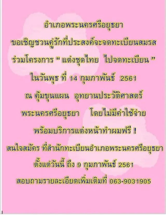 เพจ ปฏิบัติการพิเศษกรมการปกครอง ได้โพสต์เรื่องราวแห่งความรัก ว่า “มาเเต่งงานกันเถอะ ปลัดกุ๊ก สาว สวย โสด เมืองอยุธยา ประกาศหาคู่” พร้อมรอจดทะเบียนสมรส ณ คุ้มขุนเเผน อุทยานประวัติศาสตร์พระนครศรีอยุธยา ในวันที่ 14 กุมภาพันธ์นี้ ปลัดสาวสายเปย์ บอกว่าเพียงเเต่งชุดไทยมาพร้อมเข้าวิวาห์ มีช่างเเต่งหน้าทำผมให้ฟรี เเต่ต้องลงทะเบียนหัวใจกันก่อนนะจ๊ะ ชวนคู่รัก จูงมือกันมาลงทะเบียนได้ตั้งเเต่วันนี้ ถึงวันที่ 9 กุมภาพันธ์ ณ สำนักทะเบียน ที่ว่าการอำเภอพระนครศรีอยุธยา โทรนัดปลัดกุ๊กคนสวยก่อนได้ที่ 063-903-1905 แต่งานนี้หาคนจริงใจจริงจังกับความรักเท่านั้น ใครโทรมาป่วนหรือไปแกล้งปลัด เราขอเตือนไว้ก่อนนะ
