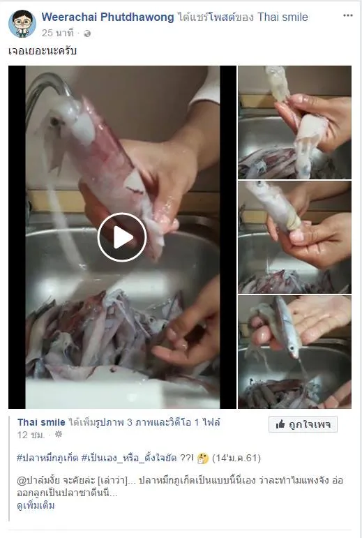 เมื่อวันที่ 14 ม.ค. 2561 ผู้ใช้เฟซบุ๊ก Apple Natcha Khruaseng ได้โสพต์คลิปภาพ พร้อมข้อความ คุณหลอกดาว เผยแพร่ปลาหมึกสดที่ซื้อมาแล้วล้างทำความสะอาดเพื่อเตรียมทำอาหาร แต่ปรากฎว่าในท้องปลาหมึกทุกตัวกลับมีปลาอยู่ในท้องปลาหมึกเกือบทุกตัว ทำให้เจ้าตัวตั้งข้อสังเกตุว่า เป็นความตั้งใจของพ่อค้าที่ตั้งใจยัดปลาใส่ท้องปลาหมึกเพื่อให้มีน้ำหนักหรือไม่