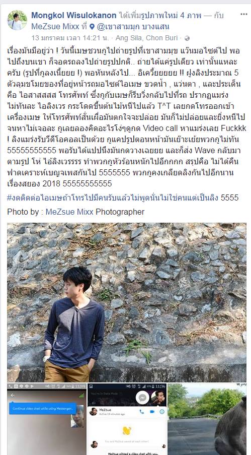 เรื่องมันมีอยู่ว่า ! วันนี้เมษชวนกูไปถ่ายรูปที่เขาสามมุข แว๊นมอไซต์ไป พอไปถึงบนเขา ก็จอดรถลงไปถ่ายรูปปกติ.. ถ่ายได้แค่รูปเดียว เท่านั้นแหละครับ (รูปที่กูลงเนี้ยยย !) พอหันหลังไป อิเควี้ยยยยย !! ฝูงลิงประมาณ 5 ตัวลุมขโมยของที่อยู่หน้ารถมอไซต์ไอเมษ ขวดน้ำ , แว่นตา , และประเด็นคือ ไอสาสสสส โทรศัพท์ ซึ่งกูกับเมษก็รีบวิ่งกลับไปที่รถ ปรากฏแมร่งไม่ทันละ ไอลิงเวร กระโดดขึ้นต้นไม้หนีไปแล้ว T^T เลยกดโทรออกเข้าเครื่องเมษ ให้โทรศัพท์สั่นเผื่อมันตกใจจะปล่อย มันก็ไม่ปล่อยและยิ่งหนีไปจนหาไม่เจอละ กูเลยลองคิดอะไรโง่ๆดูกด Video call หาแมร่งเลย Fuckkk ! ลิงแมร่งรับวีดีโอคอลเป็นด้วย กูแคปรูปตอนหน้ามันเย๊าะเย้ยพวกกูไม่ทัน 55555555555 พอรับได้แปปนึงมันกดวางเฉยยย และก็ส่ง Wave กลับมาตามรูป โห่ ไอ้ลิงเวรรรร ทำพวกกูหัวร้อนหนักไปอีกกกก สรุปคือ ไม่ได้คืนฟาดเคราะห์เบญจเพสกันไป 5555555 พวกกูคงเกลียดลิงกันไปอีกนาน เรื่องสยอง 2018 55555555555