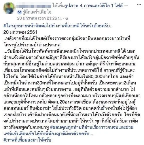#ใครถูกนายหน้าติดต่อไปทำงานที่เกาหลีให้ระวังด้วยครับ.. 20 มกราคม 2561 ..หลังจากที่ผมได้โพสต์เรื่องราวของกลุ่มมิจฉาชีพหลอกลวงชาวบ้านที่โคราชไปทำงานยังต่างประเทศ …