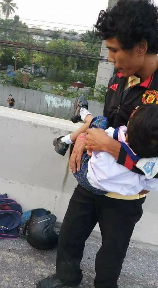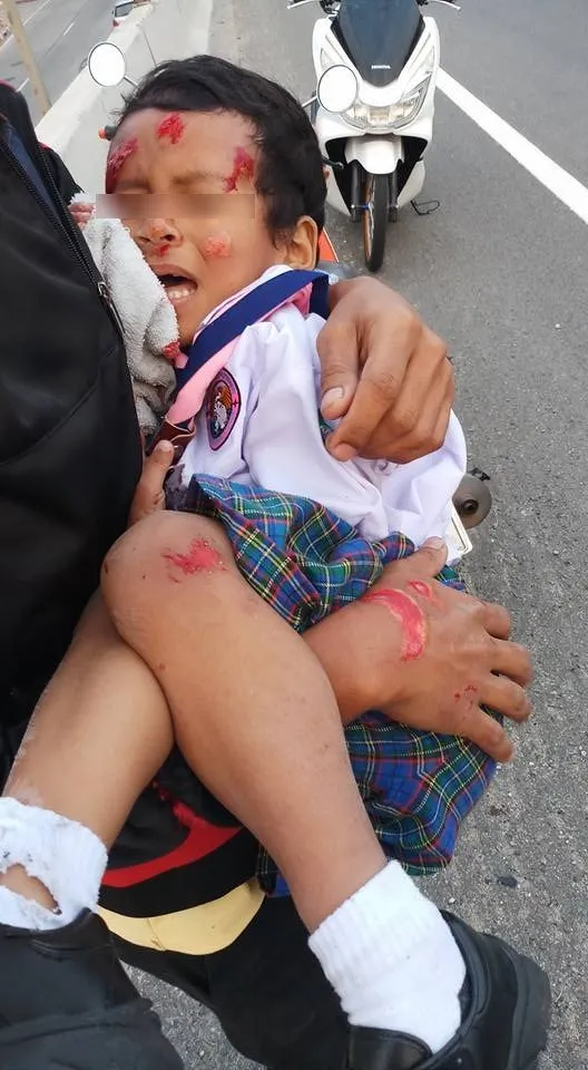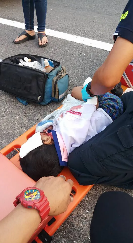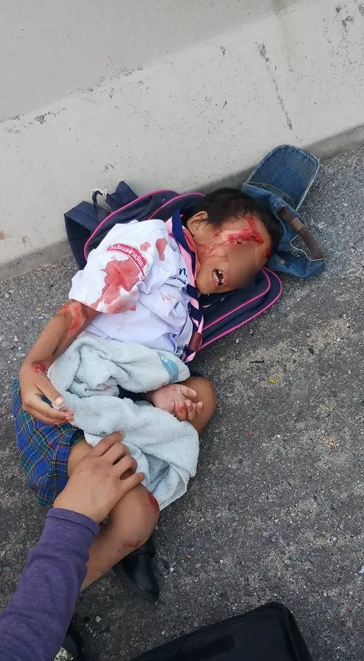 อีกแล้ว!! กระบะชนแล้วหนี ทำให้เด็กนักเรียนได้รับบาดเจ็บ แผลถลอกเต็มตัว บริเวณสะพานพระนั่งเกล้า โชคดีมีพลเมืองดีช่วยเหลือ โดย เฟซบุ๊ก Chonyuen Wisutthipat ได้โพสท์ภาพและข้อความระบุว่า