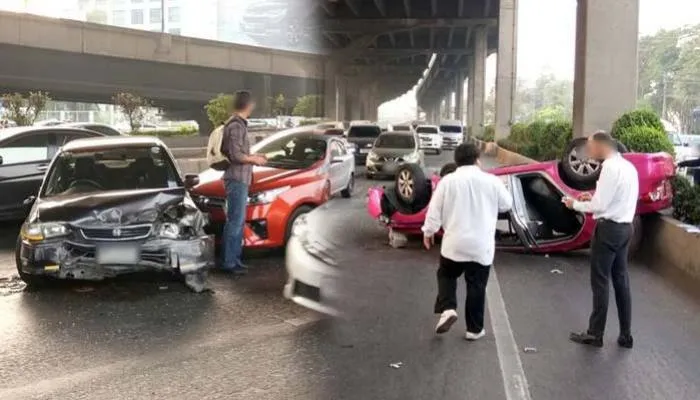 แต่พลาดไปชนเฉี่ยวชนกับรถเก๋ง โตโยต้า ยาริส สีส้ม ทำให้เสียหลักไปชนกับรถแท็กซี่สีชมพู จนเกิดการพลิกคว่ำบนถนนวิภาวดีรังสิต หน้าวัดเสมียนนารี กทม.