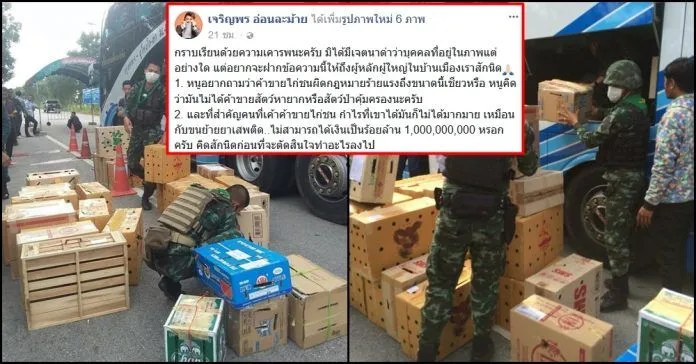 โก๊ะตี๋ หรือ นายเจริญพร อ่อนละม้าย ศิลปินตลกและพิธีกรชื่อดัง โพสต์ข้อความผ่านทางเฟซบุ๊ก ซึ่งเป็นภาพขณะเจ้าหน้าที่ทหารจำนวนหลายนาย กำลังตรวจค้น สิ่งของที่อยู่ภายในลังกระดาษจำนวนหลายกล่อง โดยระบุว่า