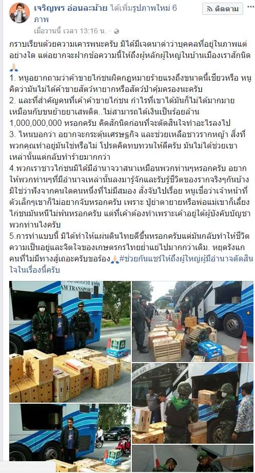 2. และที่สำคัญคนที่เค้าค้าขายไก่ชน กำไรที่เขาได้มันก็ไม่ได้มากมาย เหมือนกับขนย้ายยาเสพติด..ไม่สามารถได้เงินเป็นร้อยล้าน 1,000,000,000 หรอกครับ คิดสักนิดก่อนที่จะตัดสินใจทำอะไรลงไป