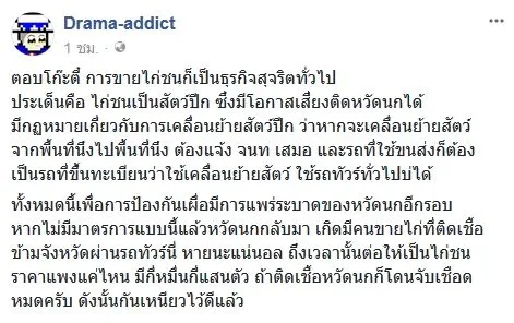 ด้านเพจเฟซบุ๊กชื่อดัง Drama-addict ได้แสดงความเห็นเกี่ยวกับการตรวจค้นไก่ชนของเจ้าหน้าที่ในครั้งนี้ว่า